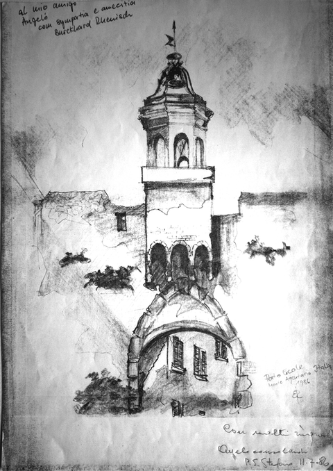 the fortress. Practically, the continuation of the picture above, where you can see part of the fortress. This drawing is also a photocopy. The original of the pencil drawing is also at Angelo's in Via Gallo 6. These two drawings are also templates for two watercolors in the morning and in the evening.