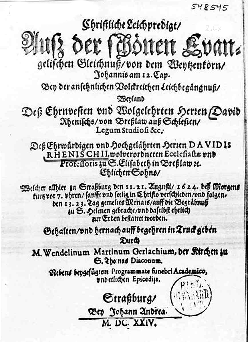Auf der Suche nach den Ursprüngen des Namens Rhenisch, sind wir auf eine erste Erwähnung des Namens in der Breslauer Stadt-Prediger Geschichte gestoßen.